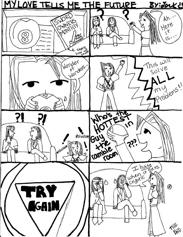 Ah, Sephiroth and the magic 8 ball. I couldn’t resist poking some fun at his devotion to this toy. My favorite panel is where Sephiroth is standing there shaking it while Vincent and Tseng look at each other confused.