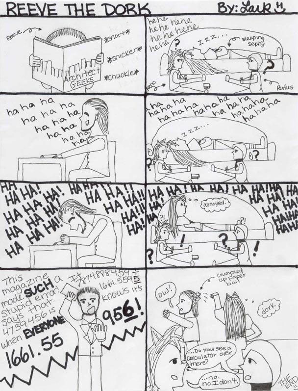 This is one of my favorite comics, and while I like the story, I like the drawings better. I like how the laughter drifts over, louder and louder, finally waking up Sephiroth and really annoying Reno and Rufus. My favorite panel is hysterically laughing Reeve, pounding his fist on the table.